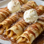 Begin by peeling and thinly slicing about 5 medium apples (about 6 cups). Sauté the apples in 2 tablespoons butter with 1/2 cup packed brown sugar, 1/4 cup granulated sugar, 1 tsp ground cinnamon, 1/4 tsp nutmeg, 1 tbsp lemon juice, and 2 tbsp flour or 1 tbsp cornstarch to thicken; cook over medium heat about 6–8 minutes until they’re tender but not falling apart. Warm 8–10 small flour tortillas (6–8 inch) so they’re pliable, spoon 1/4 cup filling into each, roll seam-side down into a buttered 9×13-inch dish, brush with 3–4 tablespoons melted butter, sprinkle with a little cinnamon sugar or chopped pecans, then bake at 350°F (175°C) for 25–30 minutes until edges brown and filling bubbles. Let rest 5–10 minutes, then drizzle with caramel sauce or a simple glaze (1 cup powdered sugar mixed with 2–3 tbsp milk and 1/2 tsp vanilla) before serving.