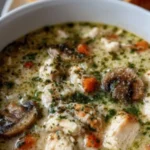 A comforting bowl of creamy chicken and mushroom soup, perfect for chilly evenings.