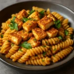 A rich, velvety creamy pasta with crispy tofu chicken, perfect for comfort food lovers.