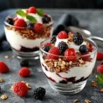 Serve these parfaits chilled for the best taste. They can be presented in a clear glass or bowl to showcase the lovely layers of yogurt, berries, and granola. You can also garnish with fresh mint leaves or shredded coconut for an extra touch.