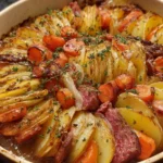 A hearty and comforting bake with layers of potatoes, carrots, and corned beef soaked in rich beef stock.