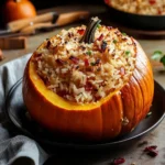 You’ll be roasting a whole pumpkin and filling it with a flavorful rice mixture, which makes this dish both simple and satisfying.