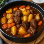 A comforting bowl of beef stew filled with tender meat, vibrant vegetables, and rich broth, perfect for cold evenings and family gatherings.