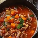 A comforting one-pot meal combining ground beef, fresh vegetables, and rich flavors, perfect for chilly days.