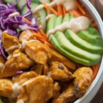 While the chicken sizzles, whisk up your sauce: it’s mostly mayonnaise, sriracha, and a bit of honey (that sweet heat is everything). Toss the chicken in the sauce—don’t be shy, coat it well. Then layer it onto a bowl of rice, add any crunchy veggies (think shredded carrots, chopped cucumbers, even snap peas if you’re feeling wild), and then—here’s the key—drizzle extra sauce on top.