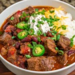 A warm bowl of Spicy Steak Chili, packed with robust flavors and comforting heat, perfect for family gatherings or cozy nights in.
