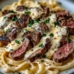 To create this delicious dish, you’ll cook the steak to your preferred doneness, then prepare a quick Alfredo sauce with butter, cream, and Gorgonzola cheese. Combine the sauce with cooked fettuccine and sliced steak for a hearty meal. Expect a creamy, rich texture that coats the pasta beautifully, along with tender steak pieces.