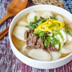 A comforting Korean traditional soup made with chewy rice cakes in a savory beef broth, perfect for any occasion.